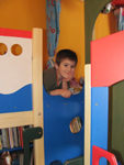 Ebben a szobában játszógaléria szerkezettel két kisfiú számára két 80*160 matrac elhelyezésére alkalmas játszófelületet hoztunk létre. A felületeket kötélhíd kapcsolja össze. A galériafelületekhez osztott szintű feljutást lehetővé tevő tornyok és hidak kapcsolódnak. A torony, a híd alja, valamint a galéria alatti tér tárolószekrényekkel, játéktároló polccal, íróasztal kialakításával lett hasznossá téve. A hídhoz további torony elem kapcsolódik, mely a csúszda kiinduló platformja. A kialakítás érdekessége, hogy a kötélhidat úgy kellett a szerkezetben kiépítenünk, hogy egyáltalán nem rögzíthettünk a falakba, mert azok hangszigetelő anyagot tartalmaztak. A kialakítás további ötleteket igényelt tőlünk, mert a viszonylag kis méretű szobát olyan mértékben kellett berendeznünk, hogy a hidat csak közvetlenül az ablak előtt futtattathattuk el. E híd korlátja szülő által bontható, ezért az ablakot az elé szerelt biztonsági korlát ellenére ki lehet nyitni.