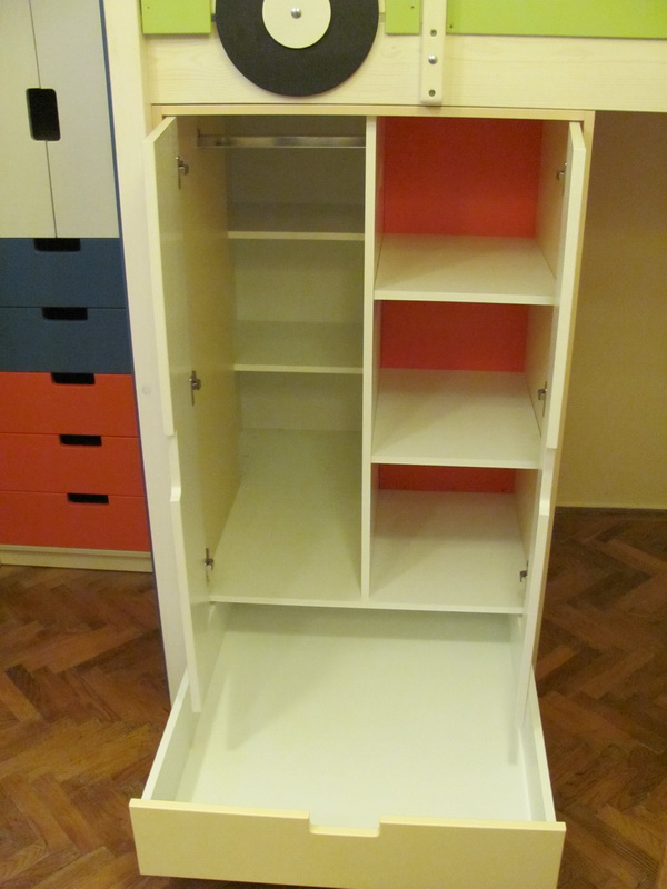 Ez az egyedi gyerekszoba egy kisfiú és egy kislány szobája. Számukra a galériával két szabályos, színes fejvégekkel szerelt ágyhelyet alakítottunk ki, melyeket középen egy közösen használt kuckós házikó oszt meg. A kuckót oldalról függönyökkel lehet lezárni, így a gyerekeknek lehetőségük van ágyaikat egymástól elszeparálni, valamint egyúttal a házikóban közösen kuckózni. A nagyobbik gyereknek egyenes létra, míg a kisebbnek osztott szintű kombinált feljáró lett kiépítve. Az osztó szint, a torony egyúttal a csúszda kiindulási pontja. A torony alja gyerekbútorral, míg a galéria alatti tér nyitott játéktároló polcokkal lett kihasználva. A túloldali falrészre nyitott és zárt játék polc, fiókos szekrény gyerekbútor került. A galériát virágos ágykorlátokkal és egyéb díszítésekkel láttuk el. A galériában elhelyezett két darab 90*160 matrac befogadására alkalmas beépített galériaágyat a későbbiekben a játszófelület csökkentésével a szerkezet megbontása nélkül 90*200 matracméretre tudjuk majd növelni.